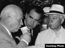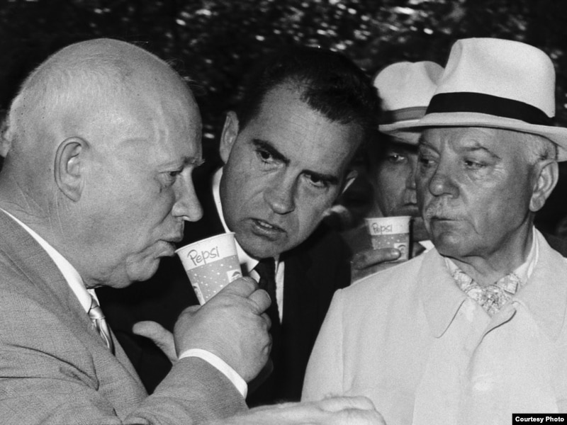 Никита Хрущев (слева) пьет пепси-колу, за ним наблюдает Ричард Никсон (в центре). Американская выставка в Москве, июль 1959 года.
