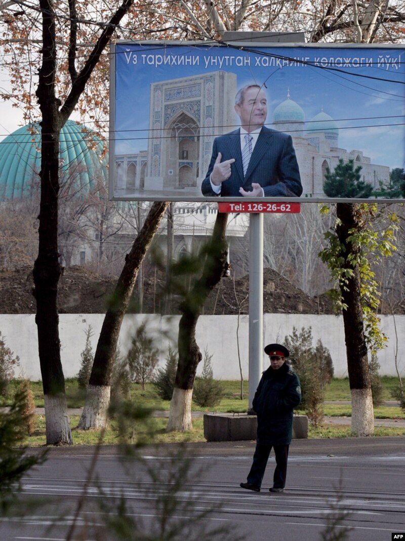 Полицейский на фоне предвыборного билборда узбекского президента Ислама Каримова. Ташкент, 21 декабря 2007 года.