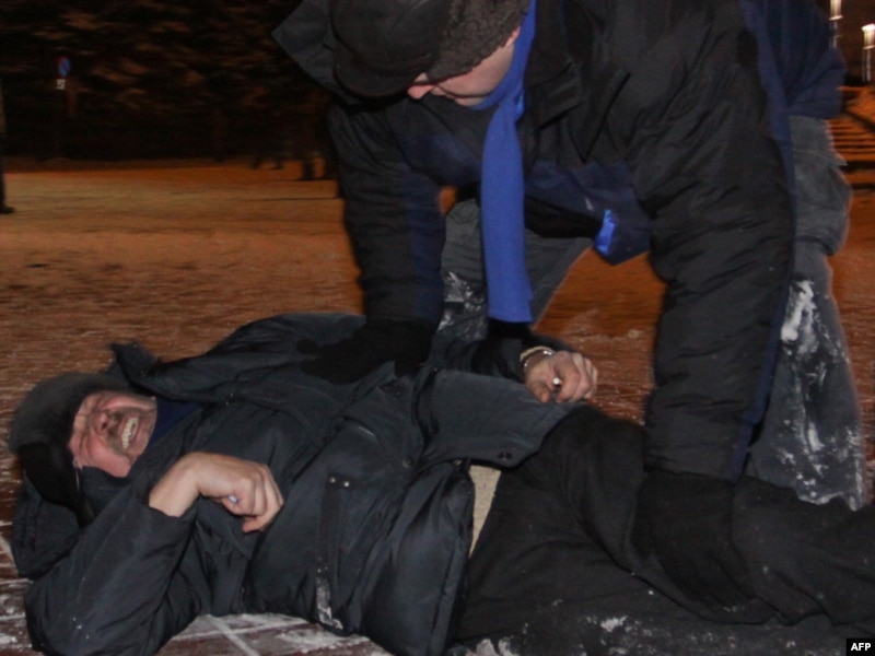 Андрей Санников, бывший кандидат в президенты Беларуси, лежит на улице после избиения во время столкновений с полицией. Минск, 19 декабря 2010 года.