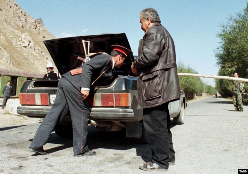 Кыргызские пограничники проверяют машину во время антитеррористического рейда.