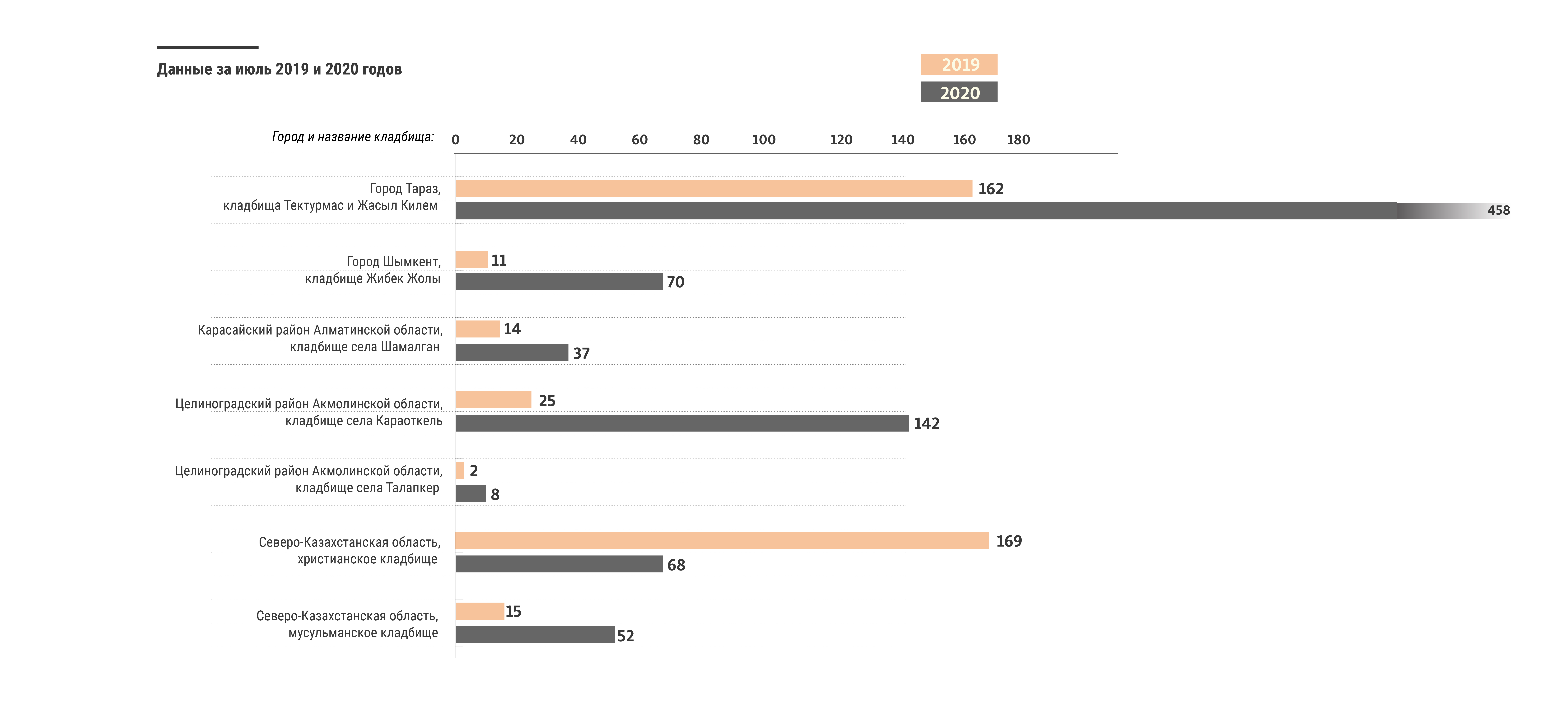 В июле прошлого года на кладбище села Караоткель в Акмолинской области было похоронено 15 человек, в июле этого года — 49. Здесь увеличение показателя составляет 326 процентов. На кладбище села Талапкер близ Нур-Султана в июле прошлого года был похоронен один человек, в июле нынешнего там появилось семь новых могил. На кладбище села Шамалган Карасайского района Алматинской области увеличение четырехкратное: восемь могил за июль прошлого года и 32 — за июль нынешнего.