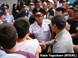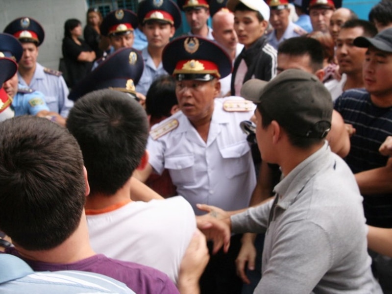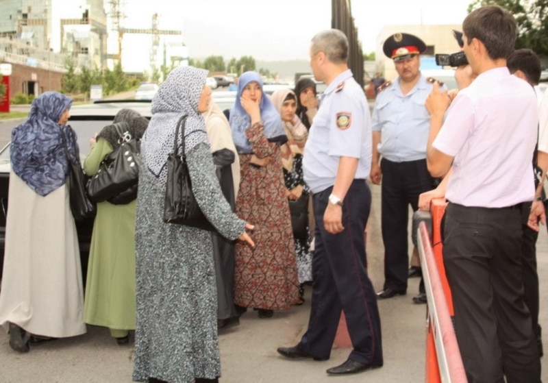Полицейские не допускают к зданию прокуратуры жен узбекских беженцев-мусульман. Алматы, 9 июня 2011 года.